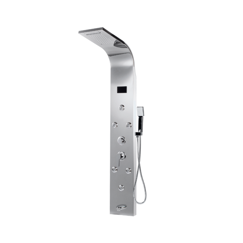 Con hidromasaje Material: Acero Inoxidable calidad 304 Color: plateado Acabado: cromado espejo. Medidas: Altura: 1,53 m / Ancho: 22 cm