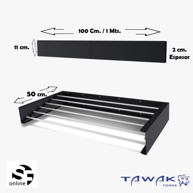 Cuerpo metalico con pintura epoxi 6 varillas de acero inoxidable Ancho: 1mt Alto: 11cm Profundidad: 50cm Incluye el kit de