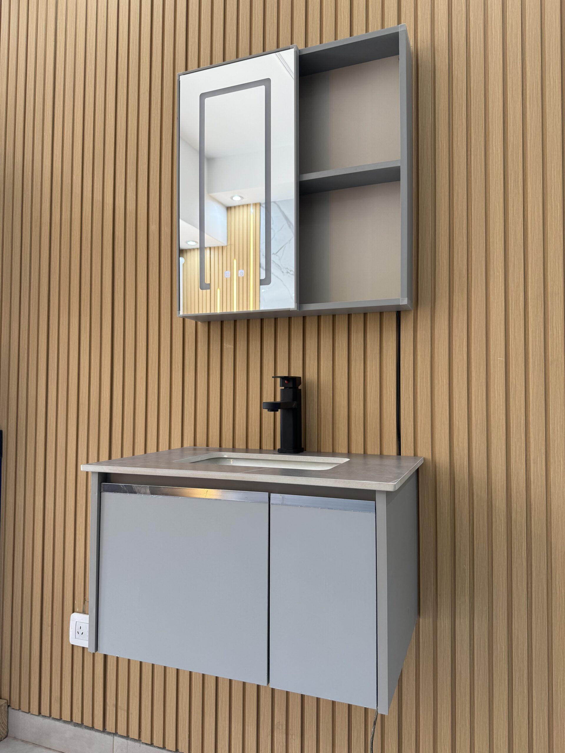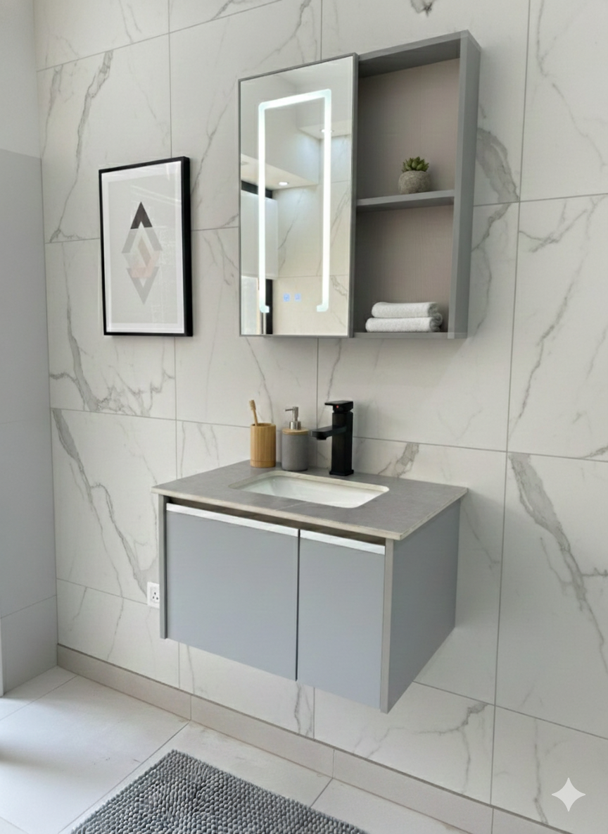 El mueble está fabricado en aluminio y PVC, garantizando durabilidad y resistencia al agua. Incluye una bacha y un espejo con iluminación LED, lo que añade un toque moderno y práctico a tu rutina de cuidado personal. Su diseño colgante no solo ahorra espacio, sino que también facilita la limpieza del área.