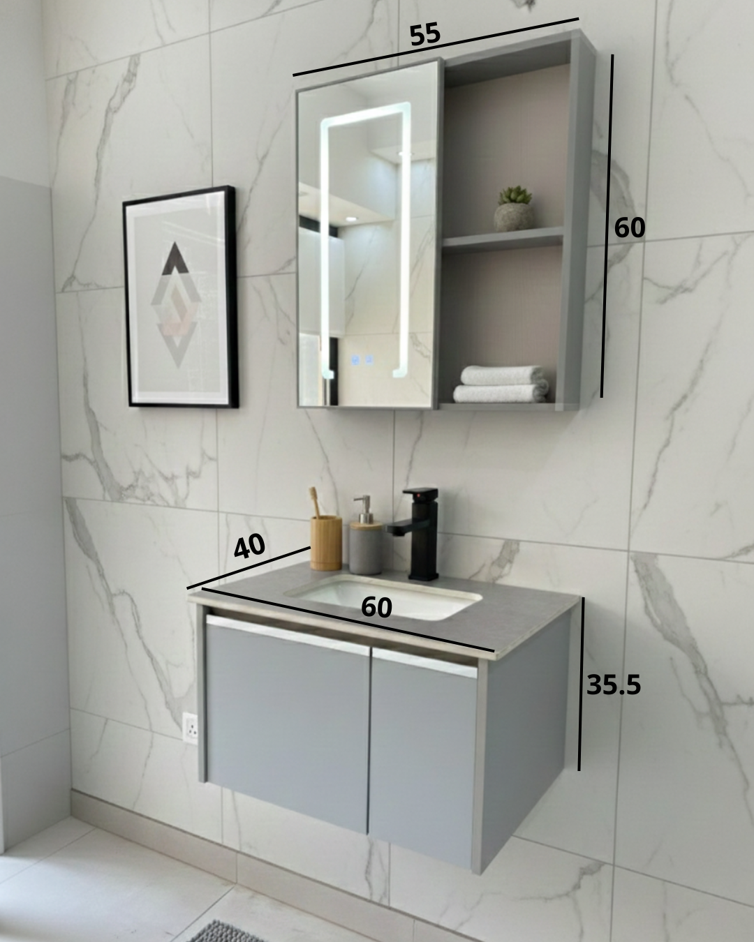 Combo Mueble Vanitory Baño 60 Cm Aluminio Espejo Led Tawak01