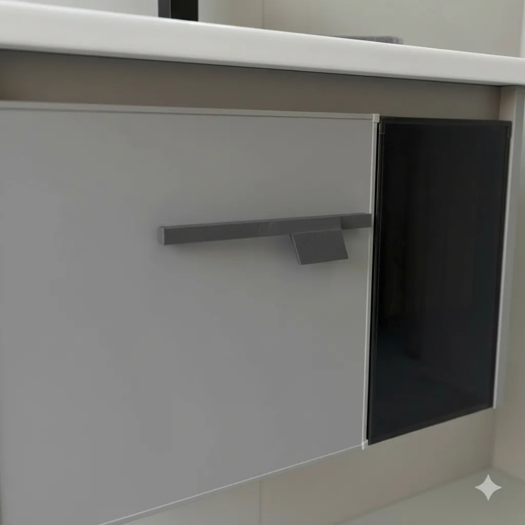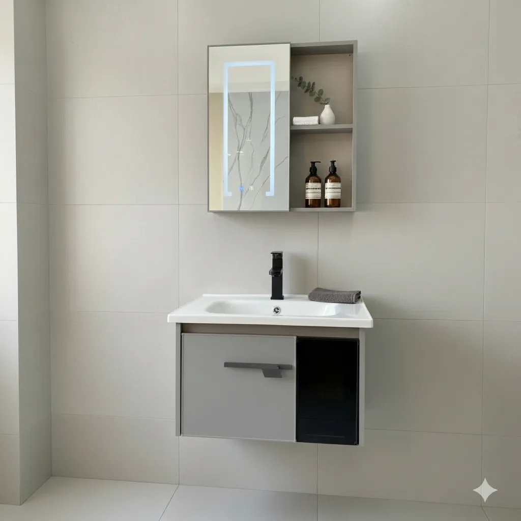 El mueble está fabricado en aluminio y PVC, garantizando durabilidad y resistencia al agua. Incluye una bacha y un espejo con iluminación LED, lo que añade un toque moderno y práctico a tu rutina de cuidado personal. Su diseño colgante no solo ahorra espacio, sino que también facilita la limpieza del área.
