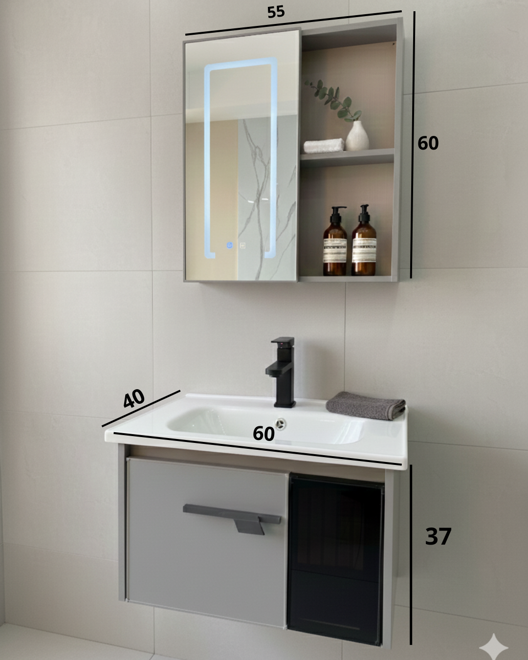 Transforma tu baño con el COMBO MUEBLE VANITORY BAÑO 60 CM ALUMINIO ESPEJO LED TAWAK01. Este elegante mueble colgante, diseñado por Tawak Force, combina funcionalidad y estilo, ofreciendo un espacio optimizado para tus necesidades diarias. Con unas dimensiones de 60 cm de ancho, 40 cm de altura y 37 cm de profundidad, se adapta perfectamente a baños de diferentes tamaños.