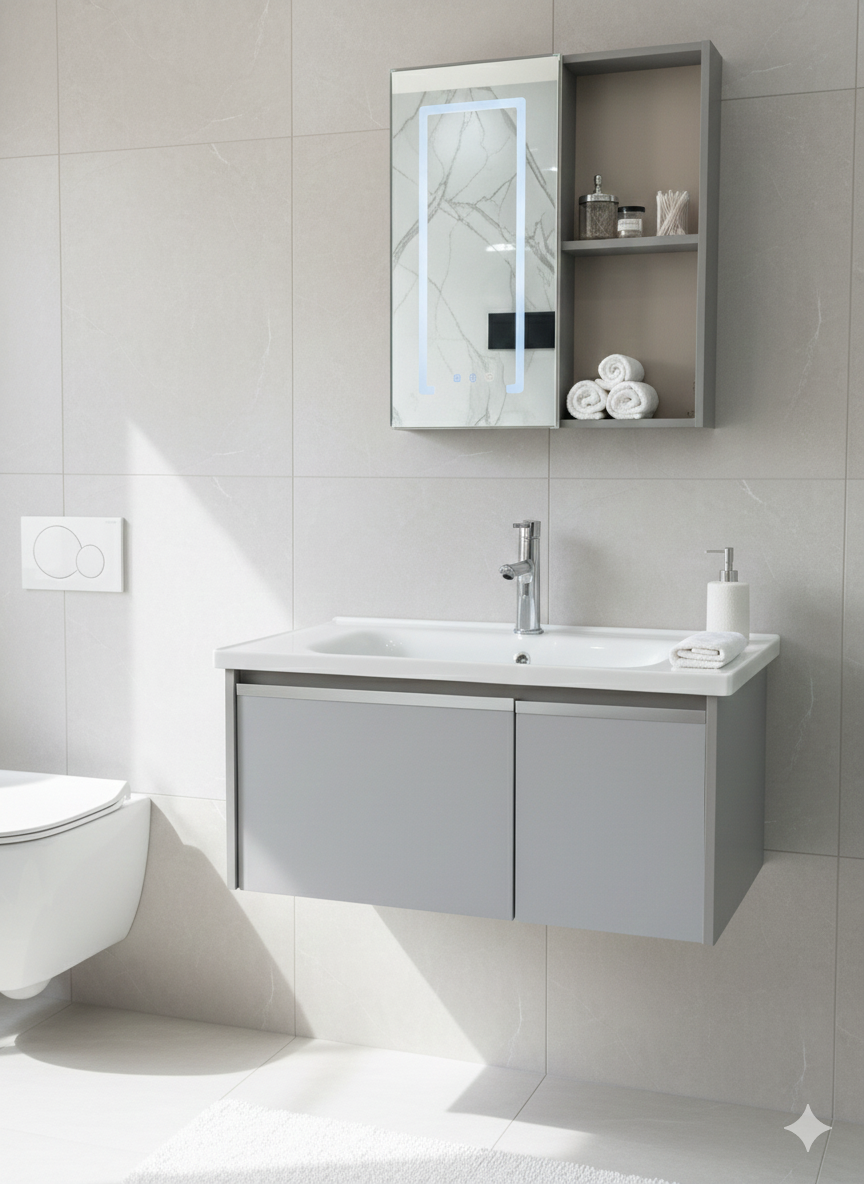 El mueble está fabricado en aluminio y PVC, garantizando durabilidad y resistencia al agua. Incluye una bacha y un espejo con iluminación LED, lo que añade un toque moderno y práctico a tu rutina de cuidado personal. Su diseño colgante no solo ahorra espacio, sino que también facilita la limpieza del área.
