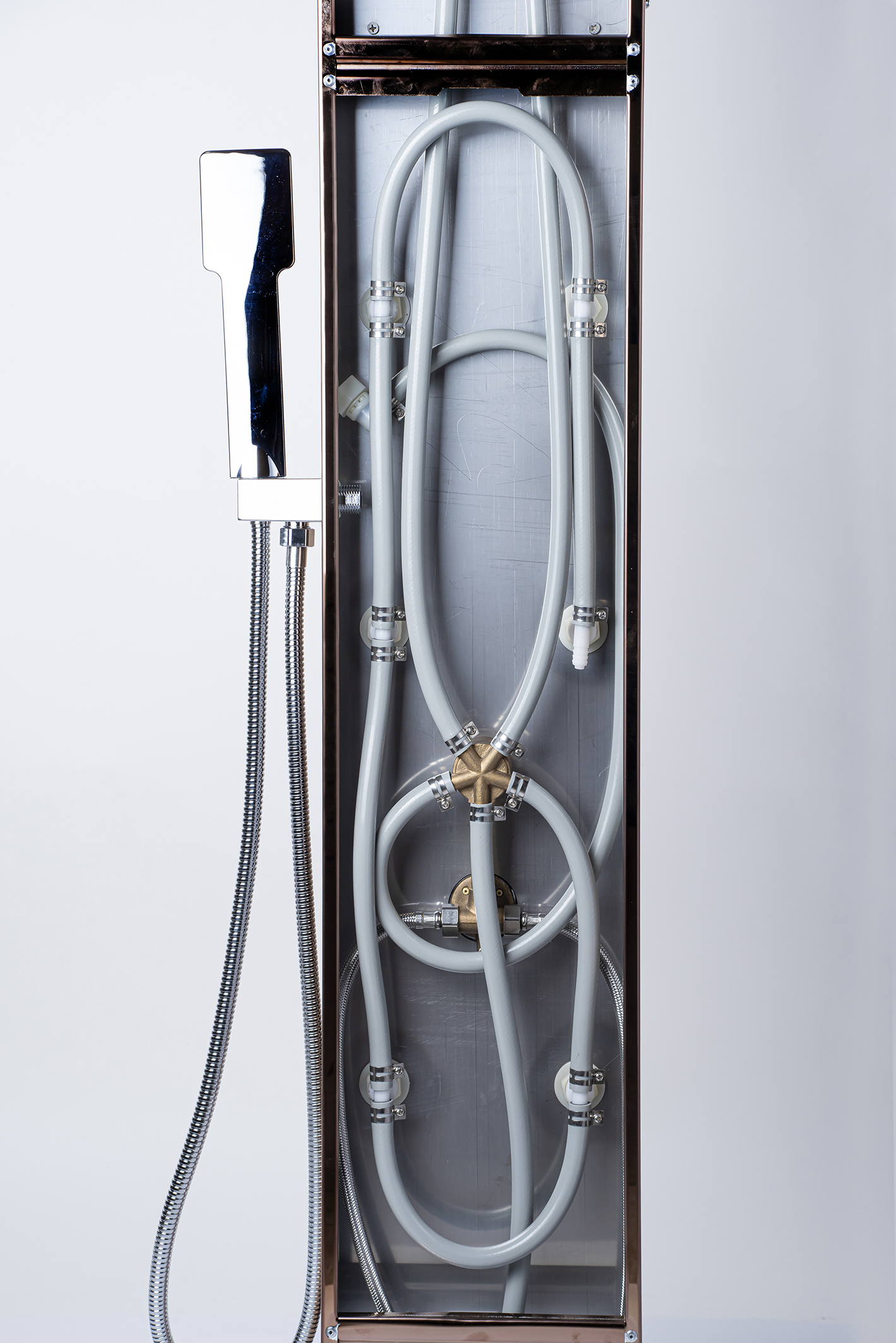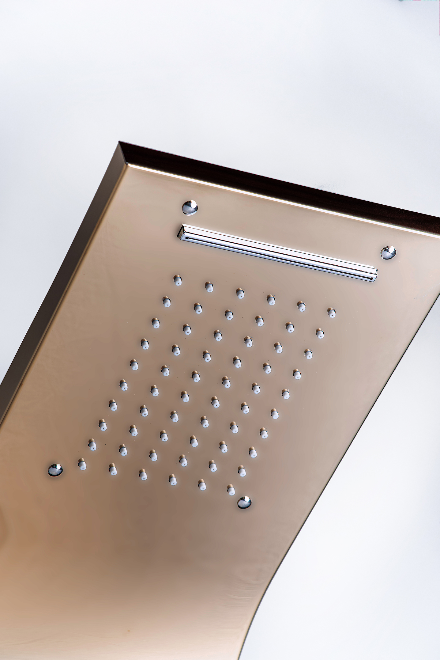 Cantidad de Jets: 6 jets redondos direccionables frontales, cascada, spray superior, canilla baja y duchador manual flexible 1.50mts.