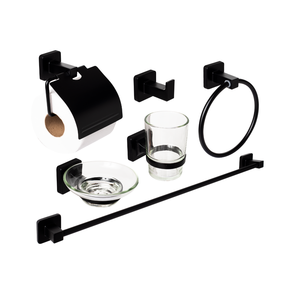 Este completo kit incluye seis piezas esenciales, todas fabricadas en acero metálico pintado en un sofisticado color negro mate, que no solo aporta estilo, sino también durabilidad.